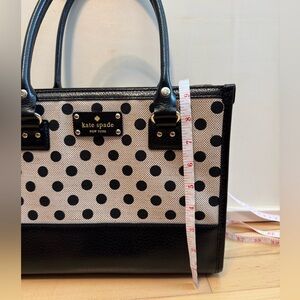✨ Classic and chic Kate Spade tote featuring a black-and-white polka dot canvas design with black leather trim.