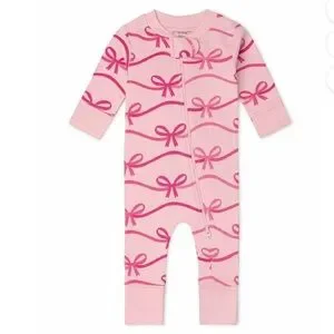 Adorable pink onesie with bow pattern and matching bib. Perfect for a cute and cozy look.