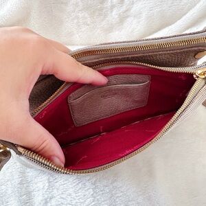 Pre-loved Hammitt Nathan Double Pouch Crossbody. Does show some signs of wear: the zipper pulls, there is a slight snag in the canvas smaller pouch and the larger pouch despite cleaning the leather still has some discoloration. See photos. The inside of both bags are clean! This bag should still have a lot of life left!! Can be worn together as two bags or separately you choose! Smaller bag is canvas, larger is the pebbled leather.
