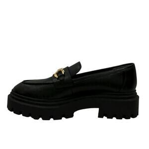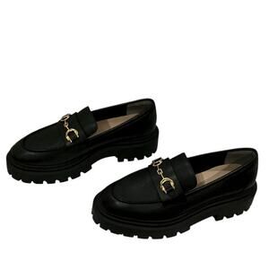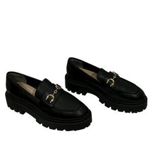 Features: Gold horsebit detail, lug sole, almond toe, flat block heel, slip-on style