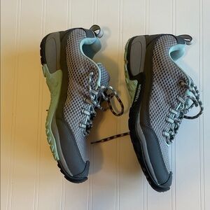 Stylish Merrell lace up hiking shoes. Features gray mesh with green accents. Perfect for outdoor activities. Like new condition.