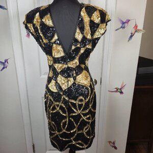 Vintage Cache Black & Gold Sequin Dress S8 80/90s Geometric Abstract Party Dress