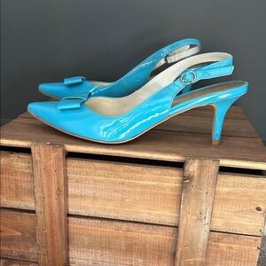 Elegant turquoise patent leather heels with slingback design. Features a stylish bow accent. Perfect for any occasion.