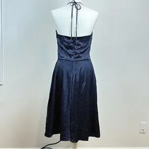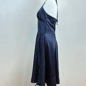 Alyn Paige women’s dress, size 10. Navy satin with white polka dot print in a retro-inspired halter silhouette. Fitted bodice with open back and flared skirt. Perfect for cocktail parties, swing dancing, wedding guests, or pinup/vintage-inspired style.