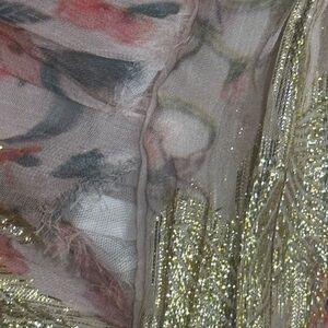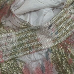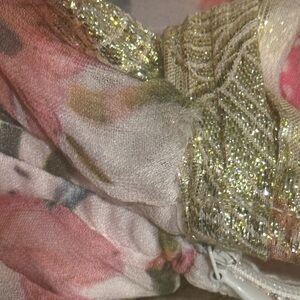 Chic dress with pink floral design and shimmering gold details. Features a flowing silhouette.