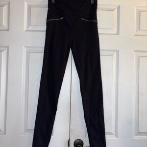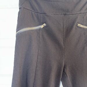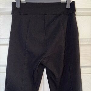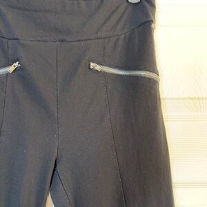 Elegant black fabric with a good stretch. Skinny style. Two front false pockets with a zipper detail. Wide 2.5” waistband. Pre-owned and in great condition. Ideal for versatile styling. Mess with the pants laying flat…