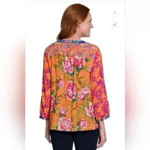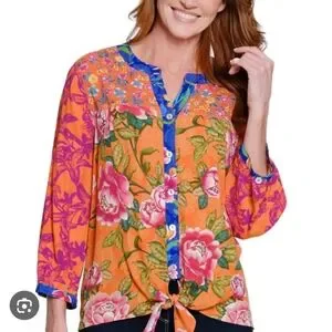Bright and breezy, this floral button-down top features a playful tie-front detail and 3/4 sleeves for a relaxed yet put-together look. Crafted from a soft viscose-rayon blend in a cheerful orange print, it’s perfect for sunny days and casual outings.