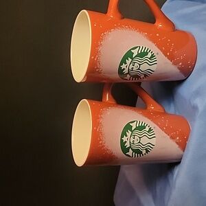 Pair of Starbucks Valentines mugs with a red and white gradient design. Ideal for coffee enthusiasts. each mug 16oz.
