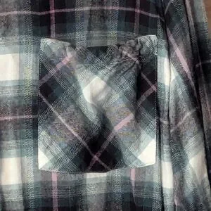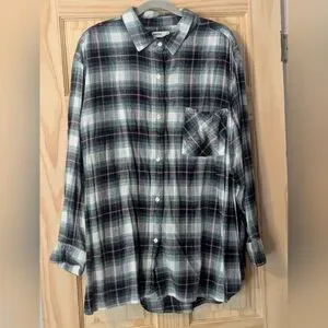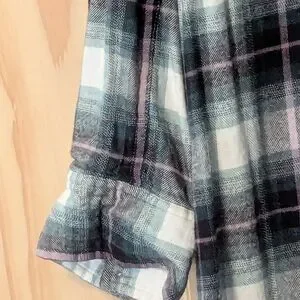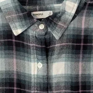 Stylish women's plaid shirt featuring a classic button-up design. Perfect for casual outings or a relaxed office look. The bust is 30", the sleeve length is 17-1/4, and the length from shoulder to the bottom of the back is 31". This top has barely been worn and is in excellent condition.