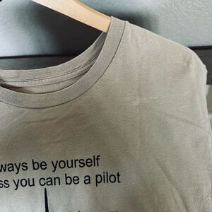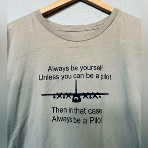 Men’s size XL Hanes Nano 100% cotton tan pilot airplane graphic T-shirt in good/fair preowned condition with overall fabric wear and some light discoloration spots as shown. Otherwise clean and nonsmoking home. Approx 23" pit to pit across chest, 19" pit to lower hem side length.