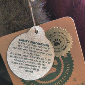 Draped in a Red Velvet cape & hood trimmed with faux fur and a Green Velvet Dress. Poseable limbs, and cute for Christmas. Boyd's is no longer producing these delightful Bears. This Bear carries a White tag and is more valuable to collectors.