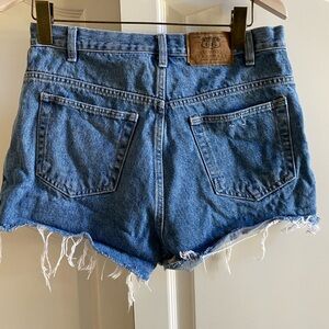 Vintage 90s cut off denim shorts by Route 66 in blue denim. Frayed hem and distress throughout.