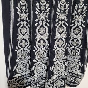 The INC International Concepts Black Sleeveless Midi Sundress is perfect for a cocktail night out. Featuring a scoop neckline, this dress combines elegance with a relaxed, flowing silhouette. The intricate white embroidery along the neckline and hem adds a touch of sophistication, making it a standout piece for any evening occasion. Made with Pima cotton, modal, nylon and Polyester materials. Excellent quality and condition. Tag says size medium.