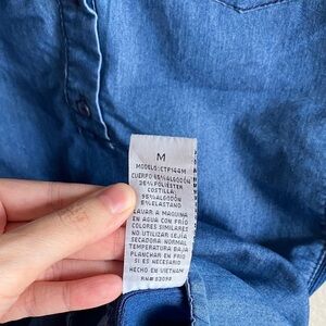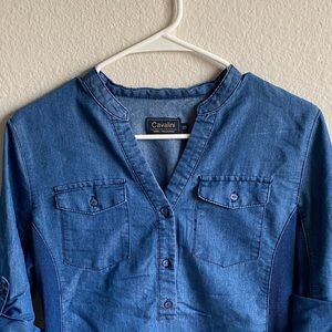 Chic Cavalini womens denim blouse with button accents. Features chest pockets and rolled sleeves. Part of the denim collection. In perfect condition. Size is medium. Brand is Cavalini.