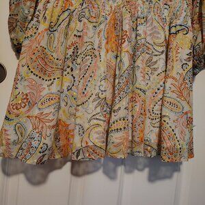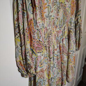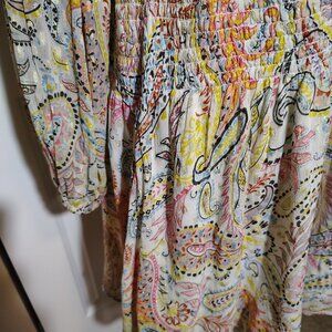 Boston Proper Paisley Bell Sleeves Metallic Threaded Mini Dress Smocked Waist