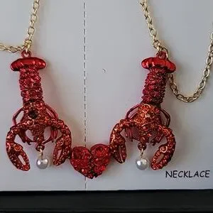 Charming lobster design with sparkling red accents. Gold-tone chain adds elegance.
