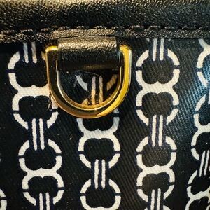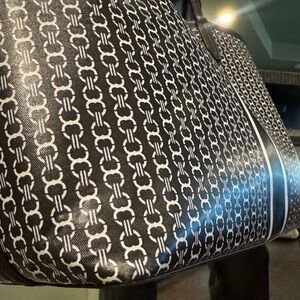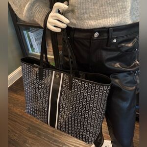 Classic, versatile, and easy to carry — the Tory Burch Coated-Canvas Geo Tote is a timeless everyday bag. Crafted from lightweight, durable coated canvas featuring the signature Gemini Link pattern, this piece boasts a sleek striped center detail and the Tory Burch logo for a polished finish. The open-top design is spacious enough for all your must-haves - ideal for work, travel, or everyday wear.