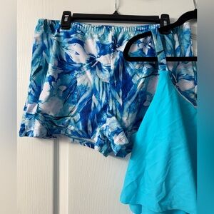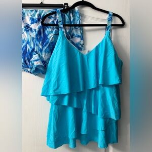 Enjoy the beach in style with this vibrant blue tropical layered tankini. Perfect for a comfortable and chic swimwear option.