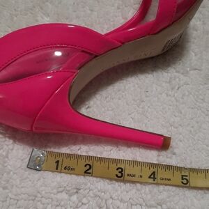 Chic hot pink heels with clear accents. Perfect for a bold look.