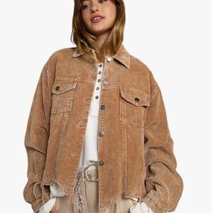 Trendy POL corduroy button up shacket in a warm brown shade. Features raw hem detailing, button front closure, and oversized fit for a relaxed, casual look. Perfect for layering in fall, styling with jeans or dresses, and adding a touch of western boho charm to your wardrobe.