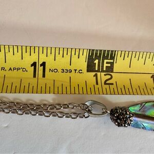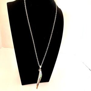 This stunning silver necklace features an iridescent abalone pendant that shimmers with every movement. Perfect for adding a touch of elegance to any outfit.