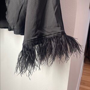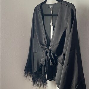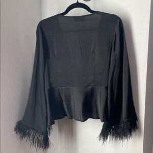 NWT VICI black satin like blouse with front tie closure and feathers on sleeve cuffs. Wear alone or great piece to wear over cocktail or formal dress. Size M