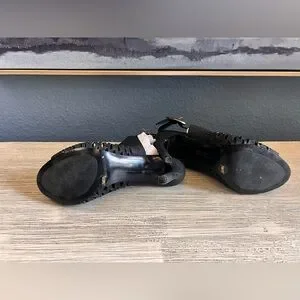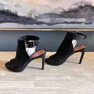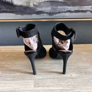 Chic black leather heels with open-toe design. Stylish and versatile.