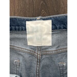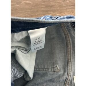 The product is a pair of Mother Superior Jeans in the Tomcat style, size 32, and medium blue distressed color. Made of denim with a high rise, these regular fit jeans feature a button closure, 5-pocket design, and logo accents. They are machine washable and made of a comfortable, stretchy cotton and elastane blend. The design incorporates elements of hipster, city, and preppy themes. Made in the United States, these jeans are perfect for all seasons and can be styled in various ways to suit different looks.