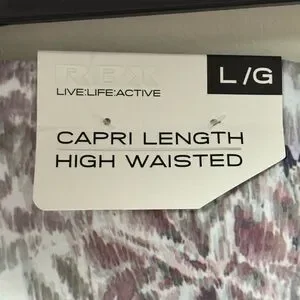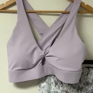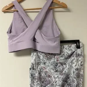 Fabletics Sports Bra in lavender and Capri RBX leggings with a high waist. Ideal for workouts. Features a stylish pattern. So cute together! Perfect for gym days or walking! Top is a XL and bottoms a L