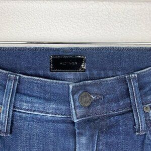 The weekender fray jean by MOTHER. Mint condition wash. Mid rise. Flared ankle. Raw hem. Stretch denim. Classic five pocket.