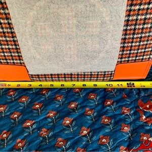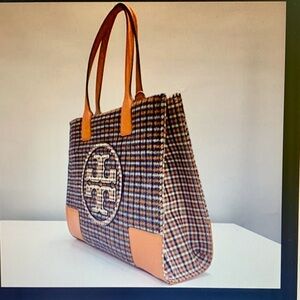 Chic Tory Burch tote with Ember Glenn plaid design. Versatile and stylish accessory.