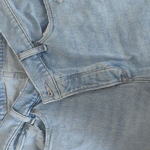 the Dad high rise jeans in light blue. Features angled button fly closure