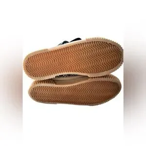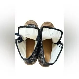 Trendy high-top sneakers featuring a unique black and white pattern. Perfect for casual wear. Loewe sneakers canvas embroidered, high top sneaker, rubber trim, leather embroidered accents, round toes, lace up closer at uppers, include dust bag. Shoe size 36 color: navy blue, very good condition