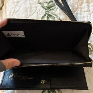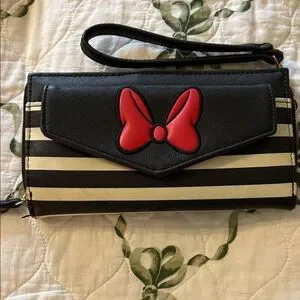 Minnie Mouse wristlet with a sleek black interior and gold zipper. Holds ID, credit cards, and plenty of space for all your Disney park essentials.