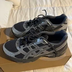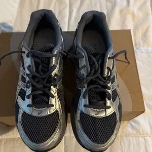 Sleek ASICS athletic shoes in silver and gray. Ideal for running and workouts. They have been worn a few times. The soles in the inside were removed. Size 8.5 men’s. Comes with Box.