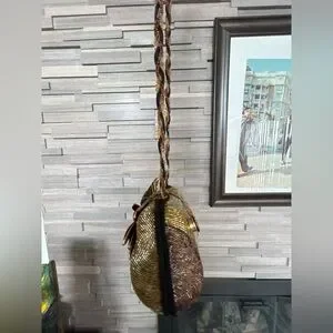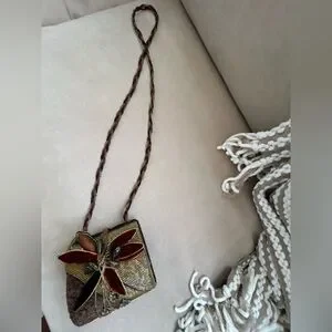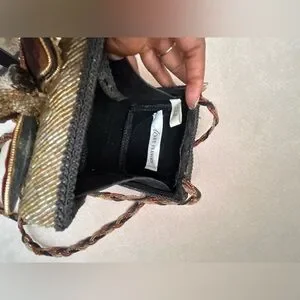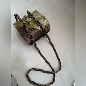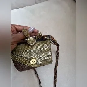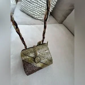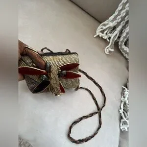 This elegant women's bag features a stunning gold and burgundy beaded design with a velvet trim dragonfly appliqué. perfect for adding a touch of sophistication to any outfit. Its unique style makes it a standout accessory for any occasion. It has a vintage vibe and is in excellent condition.