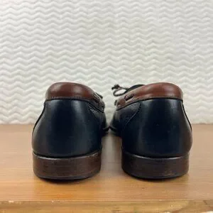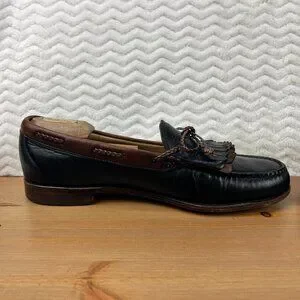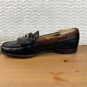Very nice pair of Allen Edmonds Woodstock Loafers Kiltie Braided Tasseled Men's size 11 B USA made. Slip On black and brown leather.