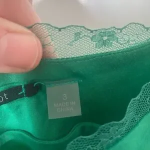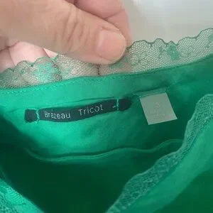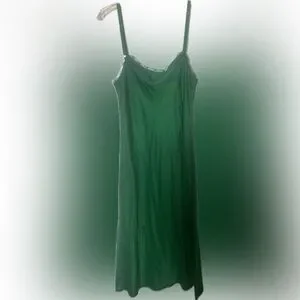 Brazeau Tricot Elegant Green is a simple pullover sleeveless slip dress with lace trim and adjustable straps.