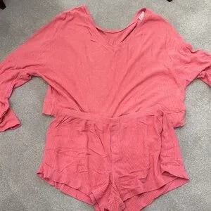 Cozy pink pajama set. Includes long-sleeve top and shorts. Soft and comfortable fabric. Top is XL and bottom is M