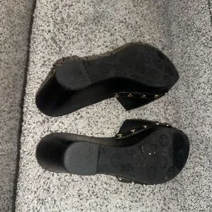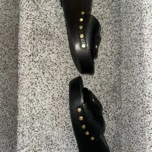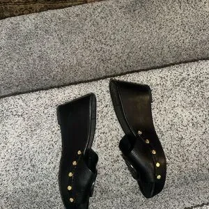 Chic black leather clogs with embossed logo. Sleek and stylish for any outfit.