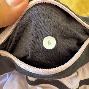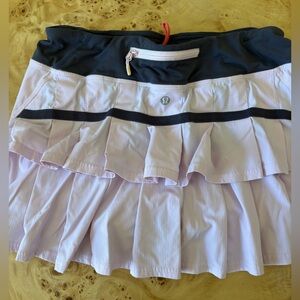 Lululemon tennis/pockleball/exercise skirt. Excellent condition, size 6. Zip pocket on waistband, drawstring inside waistband. Pleating on back, flat front. Soft pink with grey trim