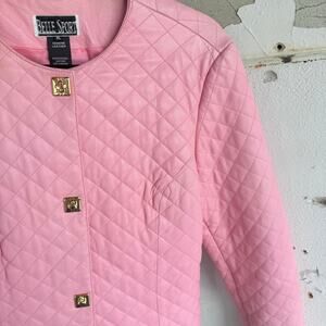 Bubblegum pink quilted leather jacket with a collarless crew neck, gold-tone buttons, and satin lining. It’s giving Chanel energy, she's the boxy layer that turns denim and a tee into an outfit and makes slip dresses read editor in chief.