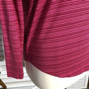 Athleta long sleeve shirt with a rounded hem, striped in shades of pink, and a stretchy scoop neck. Size Large.