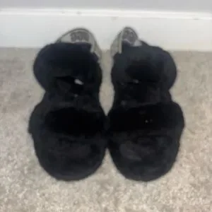 UGG Black Fluffy Slides with Logo Strap