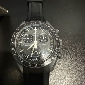 Sleek Omega Speedmaster with a bold black design. Features chronograph functionality. Ideal for any occasion.