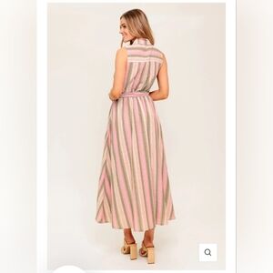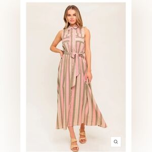 Elevate your style with this chic striped maxi dress. Featuring a blend of pink and green hues, this dress is perfect for any occasion. The sleeveless design and button-down front add a touch of elegance.