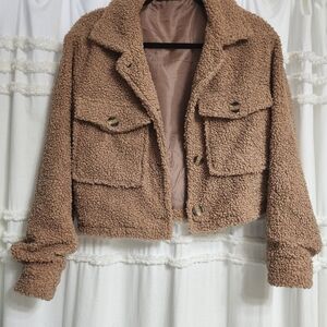 Stay warm and stylish with this cozy tan sherpa jacket. Perfect for layering, this jacket offers both comfort and fashion.