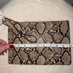 Stylish tan clutch with a sleek design. Perfect for any occasion. Gold hardware. 10in x 7in. NWT NEVER USED