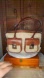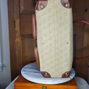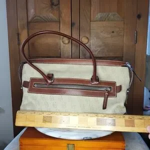 Dooney & Bourke Double Pocket Tote Signature Taupe Jacquard & Brown Leather Bag. Very good original condition. $75.