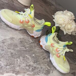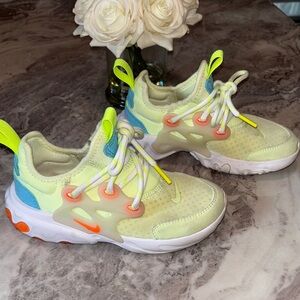 Experience the perfect blend of style and comfort with these Nike sneakers, showcasing a striking yellow and blue color palette. Crafted with Nike's React cushioning, these sneakers offer exceptional support and a modern, sporty aesthetic. Sooo cute light yellow. They are in better condition than the pictures show couple of spots on the mesh near the toes that may come off after a wash. These were adorable on her.